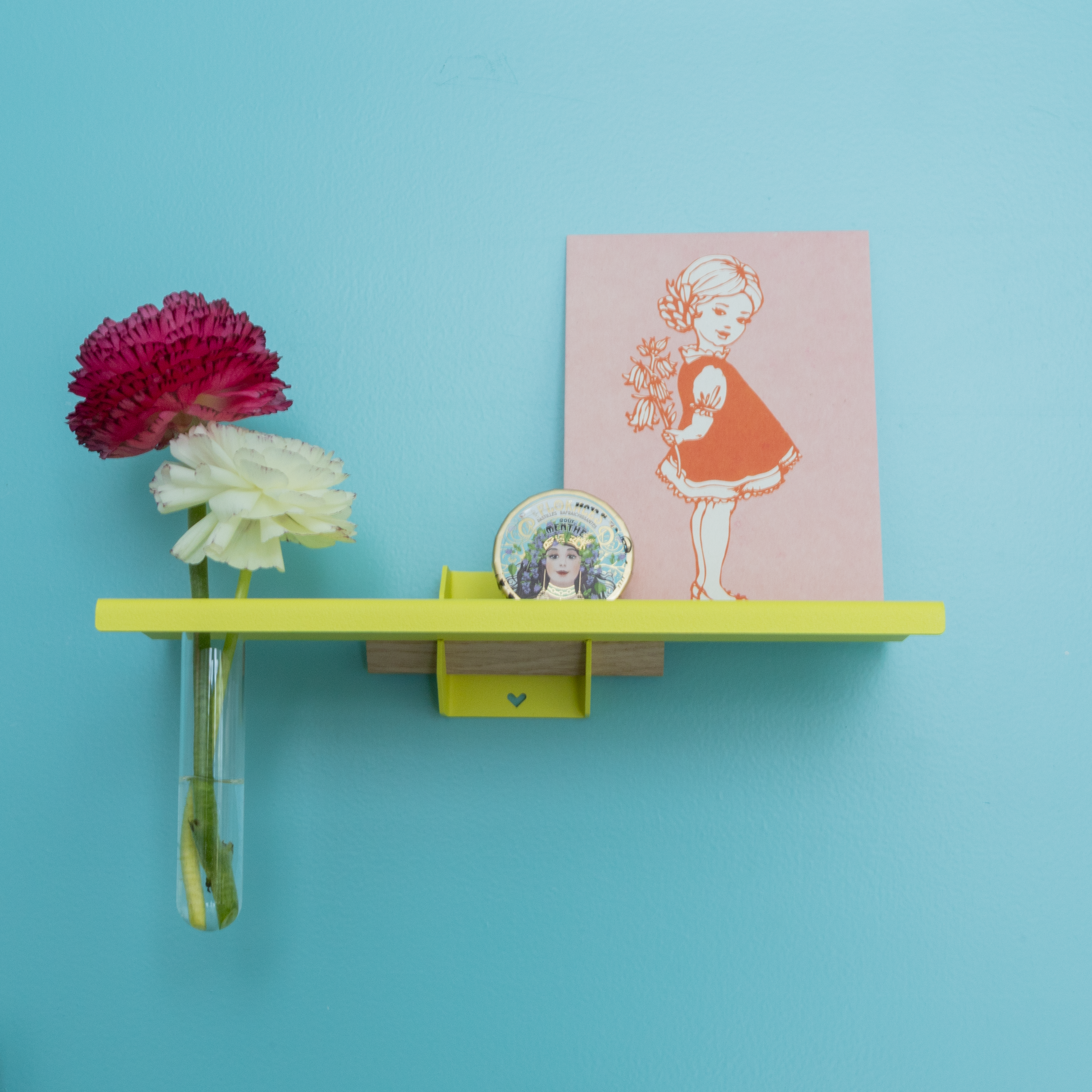 Wat volgens Mippe ontbrak in de wereld van design, maken ze zelf. Wat dat is? Ze misten de juiste manier om mooie vondsten – van design tot kringloopgeluk, maar zeker ook dat familieportret – te etaleren. Het leidde tot plankjes en schaaltjes met een ophangsystem waarmee iedereen zijn of haar unieke object kan uitlichten. De ophangsystemen zijn subtiel want zo mooi gemaakt dat ze niet opvallen, maar er wél zijn. Design, zoals design hoort te zijn. Het zijn bescheiden – vanzelfsprekend – kleurrijke ‘color pops’ die passen in elk interieur.